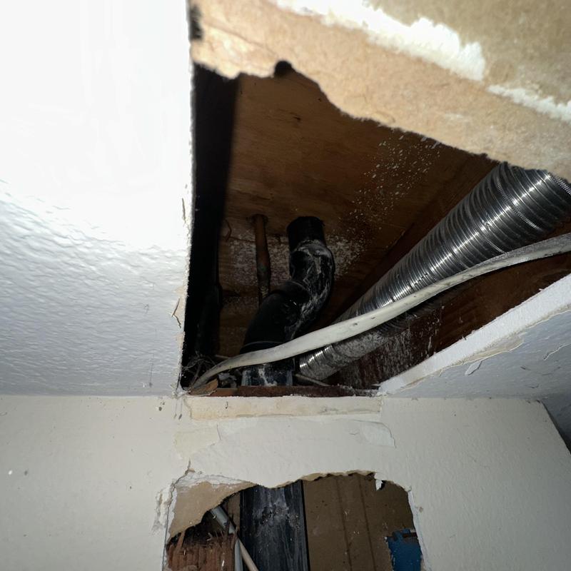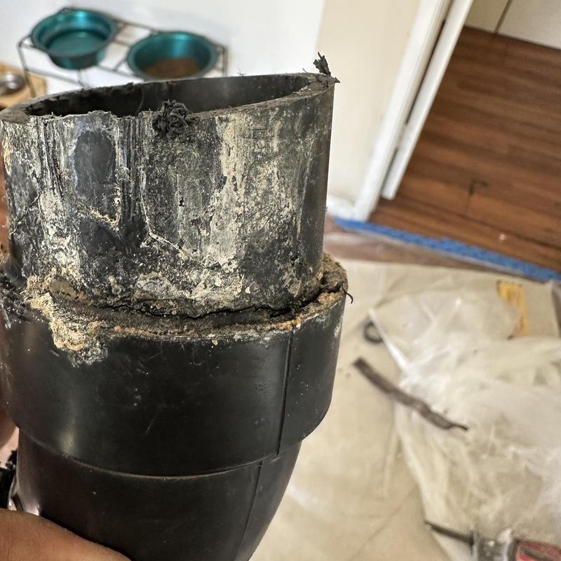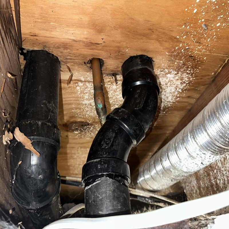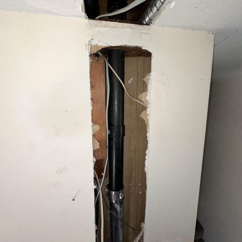 A failed ABS pipe caused water damage in a garage and downstairs bathroom in Mission Viejo, CA. To fix the issue, drywall was removed to access the plumbing. A sanitary tee fitting was replaced to stop the leak, and the downstairs bathroom toilet was also replaced.
