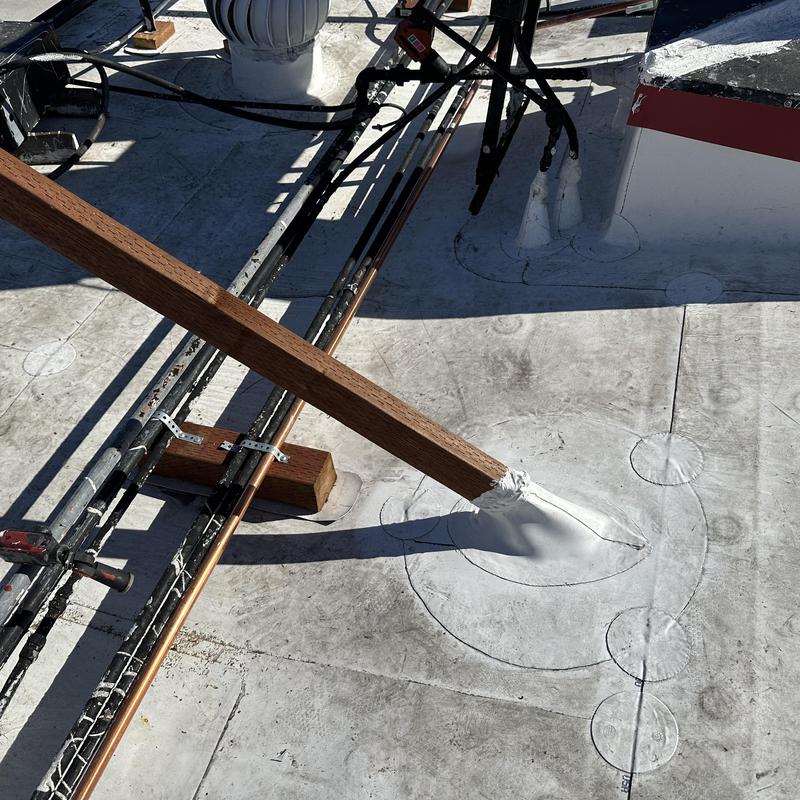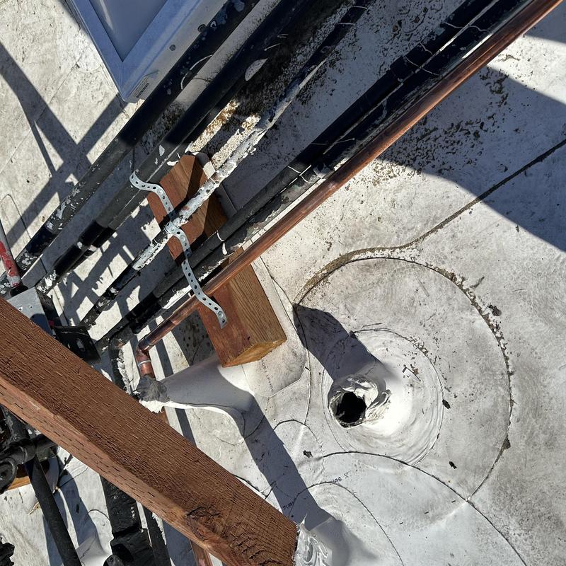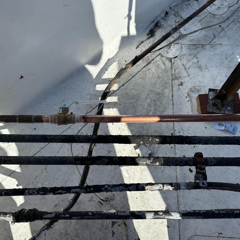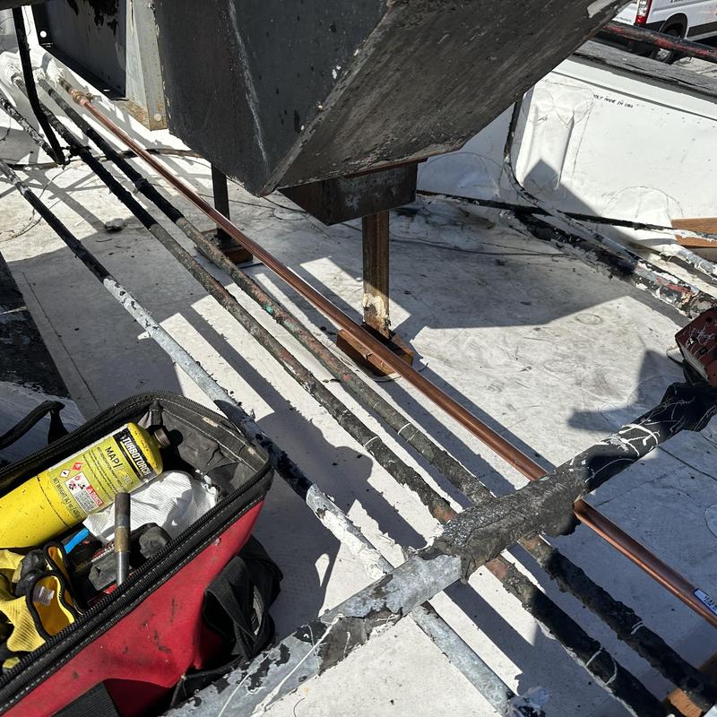 J and M Plumbers replaced a leaking section of copper pipe in a rooftop hot water recirculation system in Santa Ana, California. The repair stopped a pinhole leak that had affected the building's water distribution line.