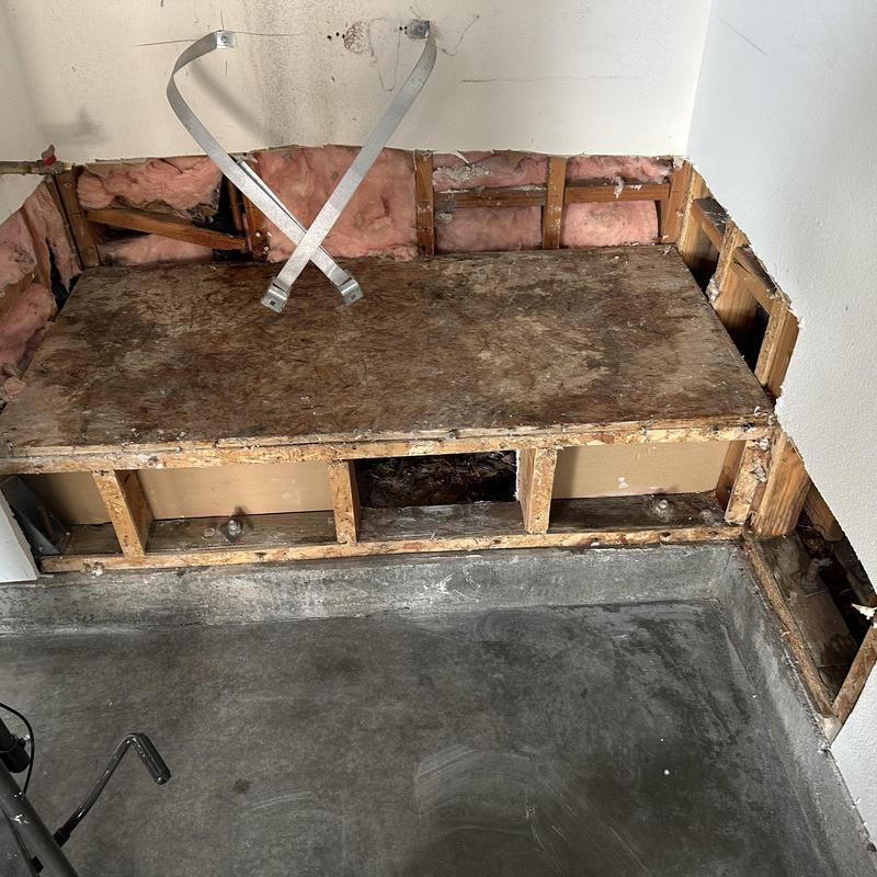 J and M Plumbers located a water leak under a bathtub in Santa Ana, California. They exposed the area using a concrete saw and demolition tools, replaced the damaged drainpipe and tub waste and overflow system, then backfilled the site. Concrete patching was scheduled following the plumbing repair.