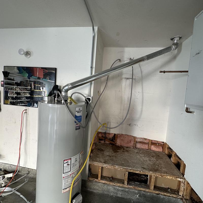 J and M Plumbers replaced a leaking water heater and removed wet drywall in Tustin, California. The technician responded to water damage caused by a bottom tank failure and completed both plumbing and minor wall repairs.